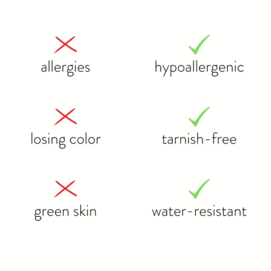 Our jewelry is resistant to sweat, water, and heat, 10 times stronger than gold-plated jewelry. It is hypoallergenic, resistant to scratches, and will not tarnish. Designed for everyday wear, with no extra care required.